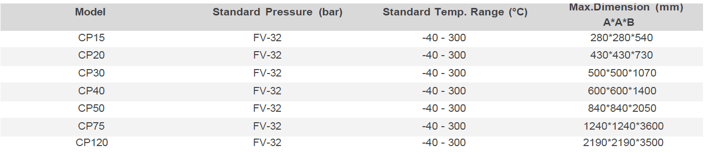 | Model | Standard Pressure (bar) | Standard Temp. Range (°C) | Max.Dimension (mm) A*A*B |