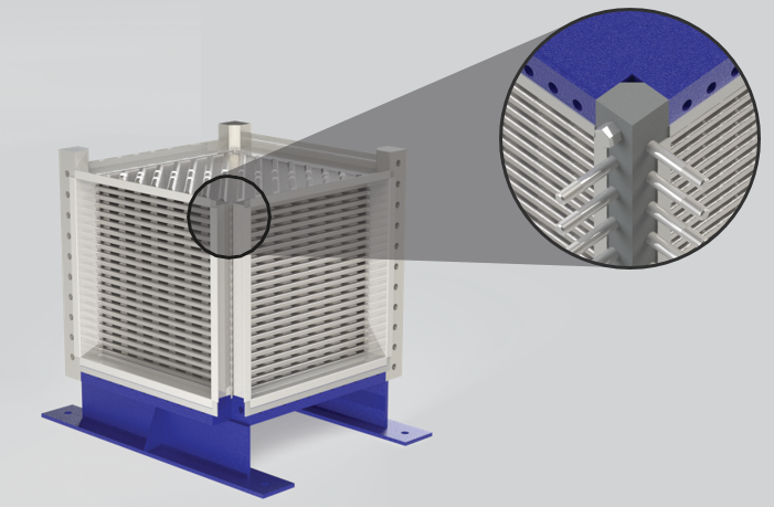 A series of baffles force the media to reverse flow direction and create a multi-pass flow pattern