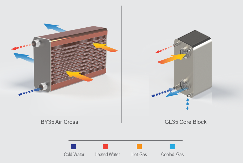 This illustration compares two types of compact Liquid-Gas heat exchangers, clearly showing the counter-flow paths of hot gas and cold water. Standardized color-coded arrows indicate the direction and nature of each fluid involved in the heat exchange process.