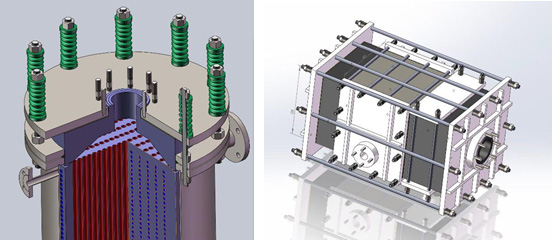 Graphite block heat exchangers consists of several impregnated graphite heat exchanger blocks with material channels, top and bottom impregnated graphite end caps, metallic cover plates (or end caps made of other materials), and a cylindrical shell (for circular block-hole type) or side plates at both ends (for rectangular block type). These components are sealed with gaskets and bolted together. The impregnated graphite heat exchanger blocks, encapsulated in steel components, can be either cylindrical or rectangular in shape. The heat exchanger blocks are drilled with a series of channels in both horizontal and vertical directions, forming process and service channels. Two fluids flow through channels in different directions, and heat is transferred through the graphite walls without direct contact between the fluids. Graphite block heat exchangers are one of the most common, flexible, and durable graphite heat exchangers used in corrosive industry applications. They are suitable for high-corrosion chemical fields and are typically used for cooling, condensation, heating, evaporation, and absorption processes.