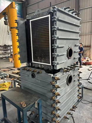 A stack of block-hole type impregnated graphite blocks is sealed with flexible PTFE gaskets and then encapsulated in a steel shell. The assembly must be done vertically. During use, the Graphite block heat exchanger can be installed vertically, horizontally, or at an inclined angle.
