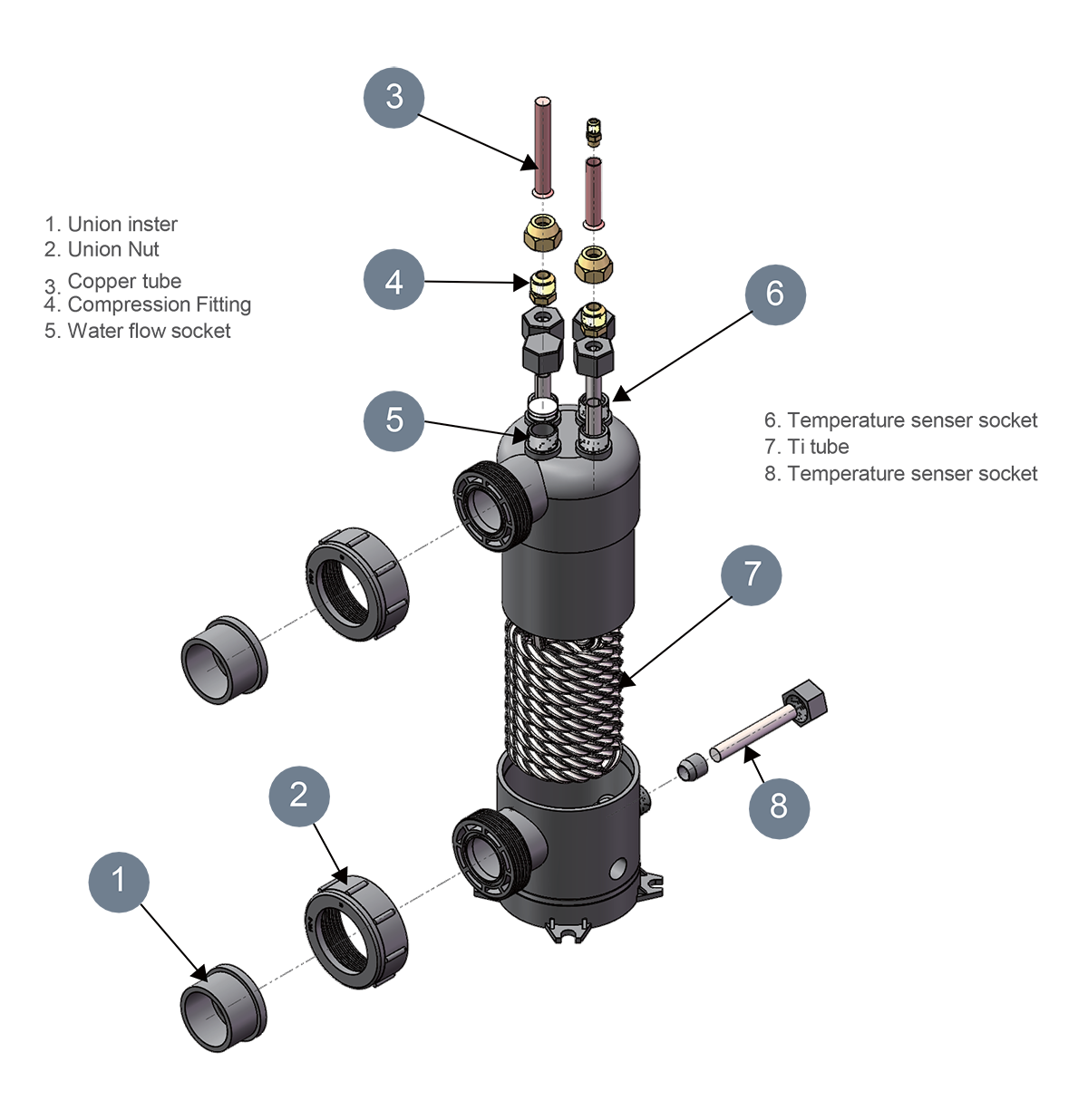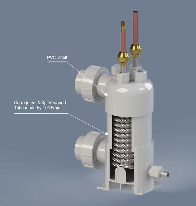 Refrigerant Side: High-pressure refrigerant gas enters the titanium tubes and releases heat, condensing into a liquid.