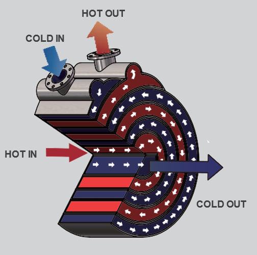 counter-current flow. Typically, the hot fluid enters at the center and flows outward toward the periphery, while the cold fluid enters at the edge and flows inward toward the center. This counter-flow configuration ensures highly efficient heat transfer.(Figue 1)