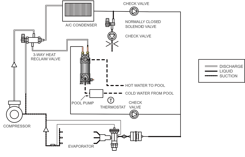 Water Side: Cooler pool water in the PVC shell absorbs the heat from the refriger- ant, warming the water before it returns to the pool.