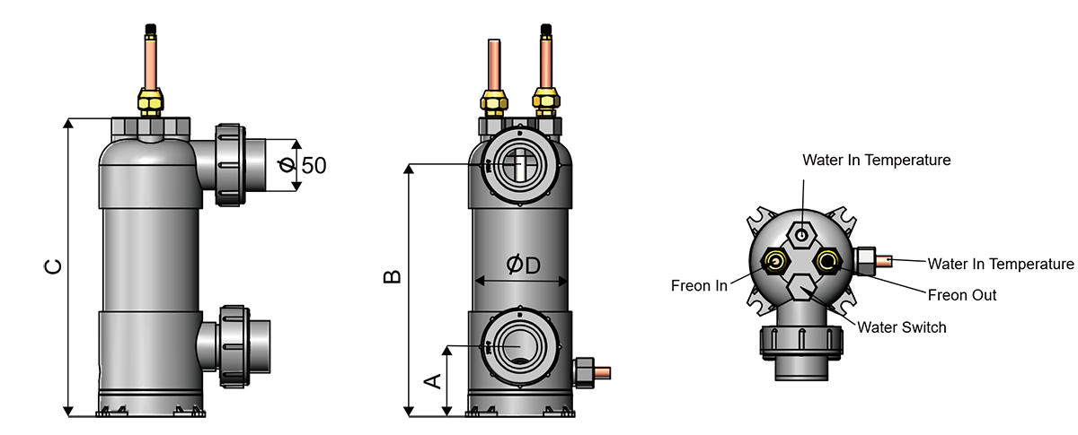 Refrigerant Side: High-pressure refrigerant gas enters the titanium tubes and releases heat, condensing into a liquid.